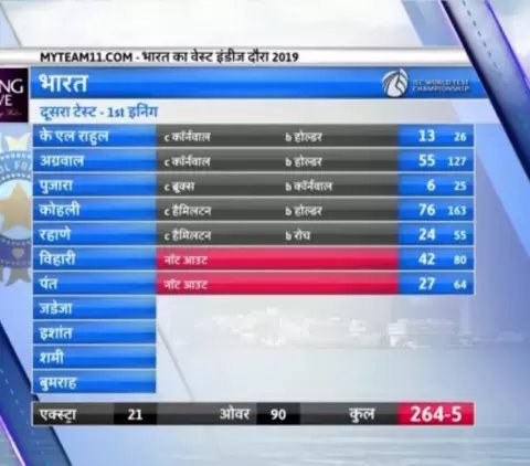 वही इस पारी में भारतीय टीम ओपनिंग बल्लेबाज मयंक अग्रवाल ने 55 रन की शानदार अर्धशतकीय पारी खेली है जिसमे उन्होंने 7 चौके भी लगाए है वही कप्तान कोहली ने भी वेस्टइंडीज के खिलाफ पहली पारी में 76 रन की शानदार पारी खेली हैं.