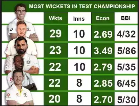 गोल्डन बॉल की रेस में सबसे ऊपर ऑस्ट्रेलिया के धाकड़ गेंदबाज पैट कमिंस है, जिन्होंने टेस्ट चैंपियनशिप में अभी तक 29 विकेट लिए हैं। वही दूसरे स्थान पर स्टुअर्ट ब्रॉड है, जिन्होंने टेस्ट चैंपियनशिप में 23 विकेट लिए हैं। भारत के बेहतरीन गेंदबाज मोहम्मद शमी इस सूची में तीसरे नंबर पर हैं, जिन्होंने टेस्ट चैंपियनशिप में 22 विकेट लिए हैं।